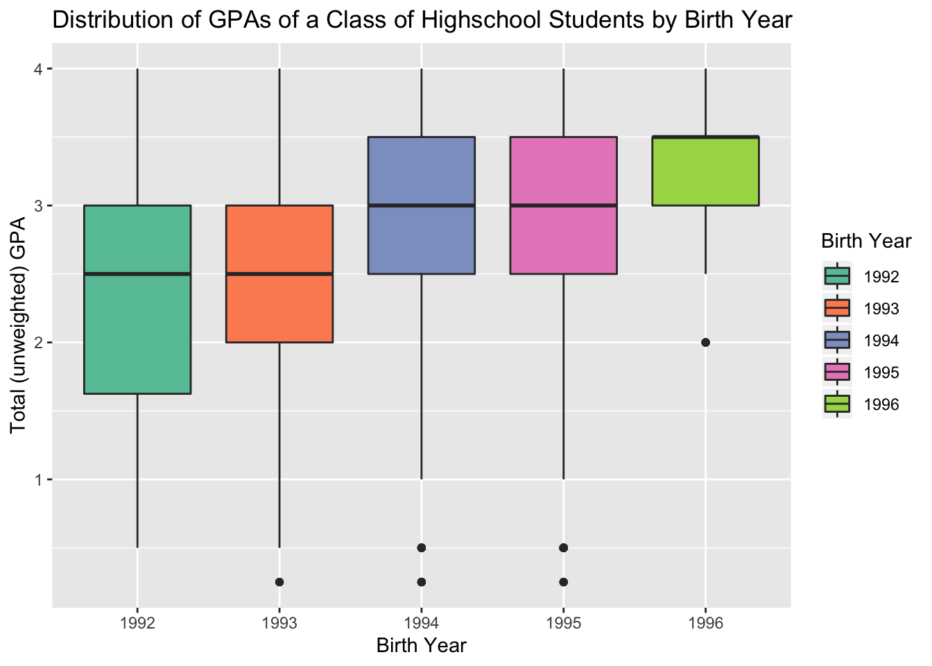 This visualization showing the distributions of unweighted total high school GPA, a standard, objective measurement of academic success, by birth year is surprising because it shows that the oldest students, born in 1992 and 1993, have significantly lower GPAs than the other birth years. Furthermore, the youngest students, born in 1996, have the highest median GPA. This is contrary to the belief that holding children back makes them more likely to succeed academically.