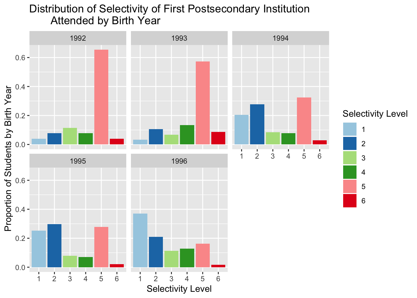 This barplot shows the proportion of students born in each year who attended a postsecondary institution within each category of selectivity. The scale is as follows2: