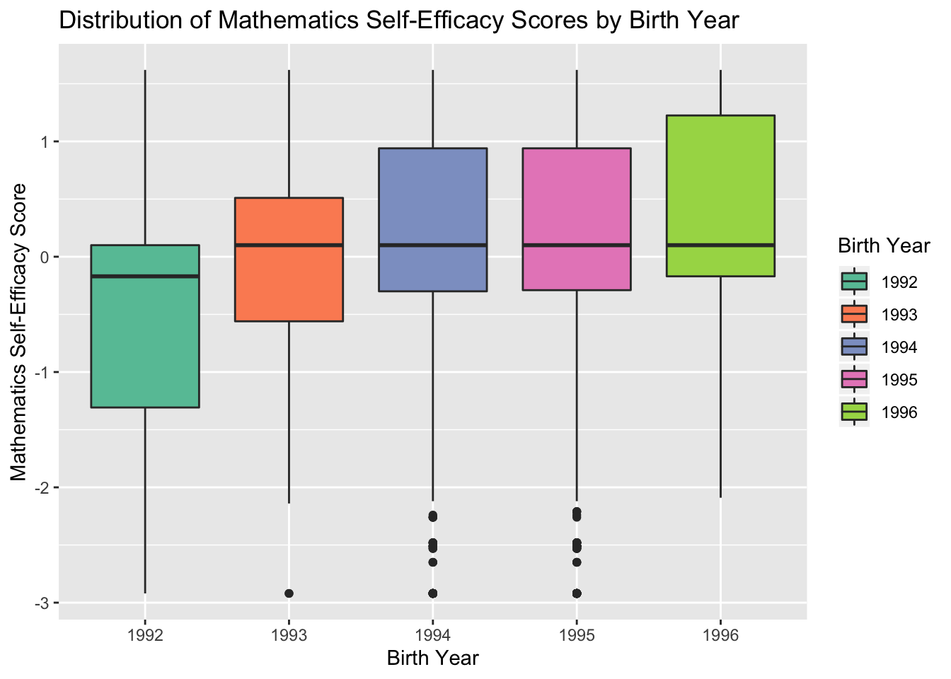 However, the graphs indicate that birth year does not have a significant effect on mathematics self-efficacy with the exception of the birth year of 1992, whose median score is significantly below that of the other birth years. Because there were so few students born in 1992, this result may simply be due to random variation. The medians for the other birth years are all remarkably close together, all very close to the overall mean of zero.
